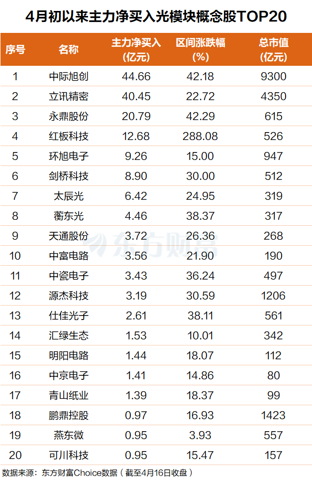 东方财富Choice数据显示,自今年4月初以来,主力资金抢筹多只光模块概念股,净买额前20个股合计超170亿元。