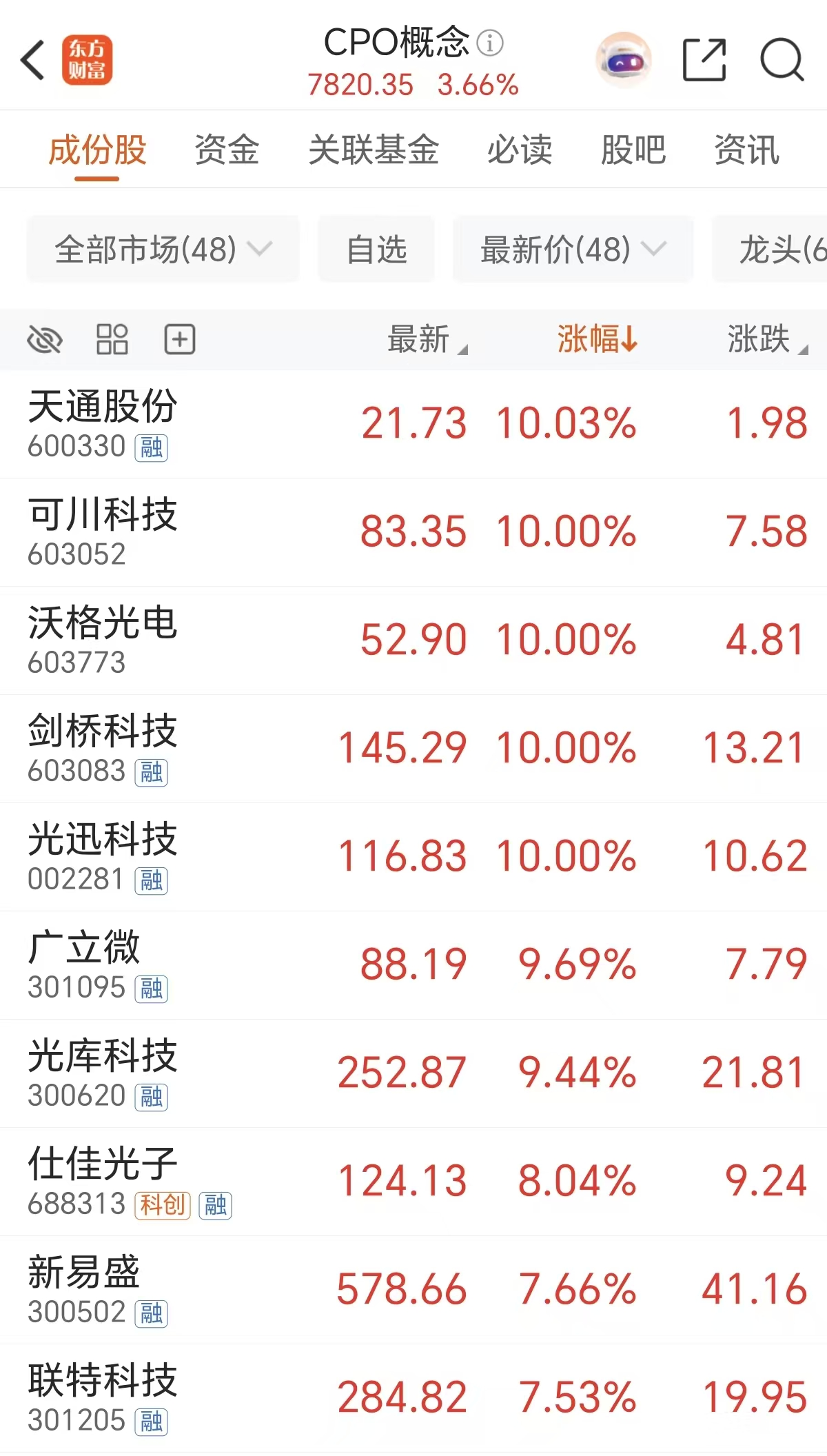 周五CPO概念延续强势,截至午间收盘,天通股份、剑桥科技、光迅科技等多股涨停,新易盛大涨近8%,天孚通信涨近5%,中际旭创涨超3%。