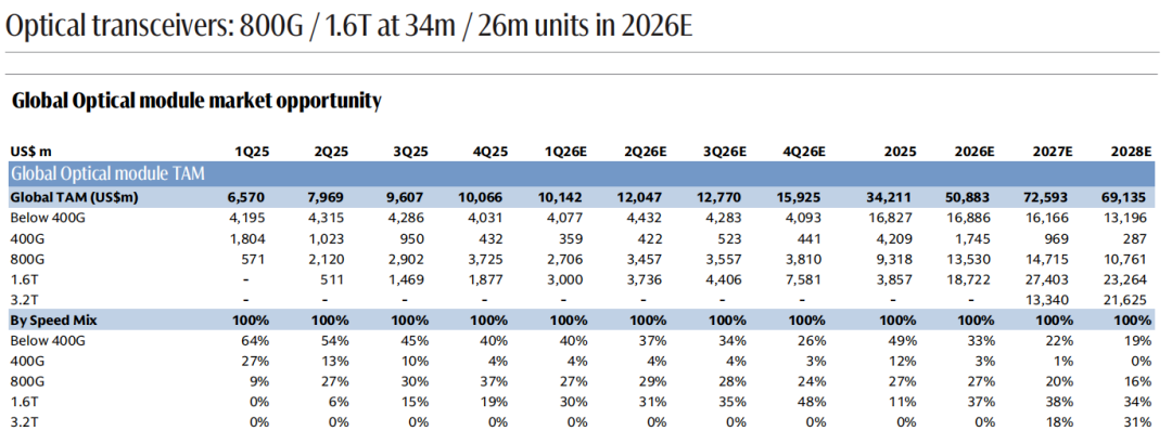 高盛预计 2026–2028 年全球光模块总需求分别为4.52 亿只、5.28 亿只、5.56 亿只;其中由 AI 数据中心主导的 800G 及以上高端市场,2026–2028 年复合年均增速达45%,2028 年需求将升至1.26 亿只。通用数据中心与电信领域仍以 400G 及以下产品为主,高盛预计 400G 及以下产品出货占比将从 2026 年的87%降至 2028 年的77%。